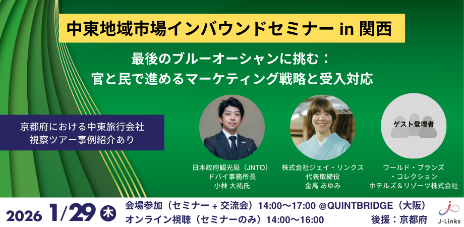 日本にとってほとんど未開拓でありながら、世界有数の高付加価値旅行市場として注目される中東地域・GCC(湾岸協力理事会)加盟国(アラブ首長国連邦、サウジアラビア、カタール、クウェート、バーレーン、オマーン)からのインバウンド(訪日外国人旅行)誘客に向け、実践的なマーケティング戦略と受入体制整備を学ぶ無料セミナーを大阪・京橋(会場:QUINTBRIDGE)で開催いたします。