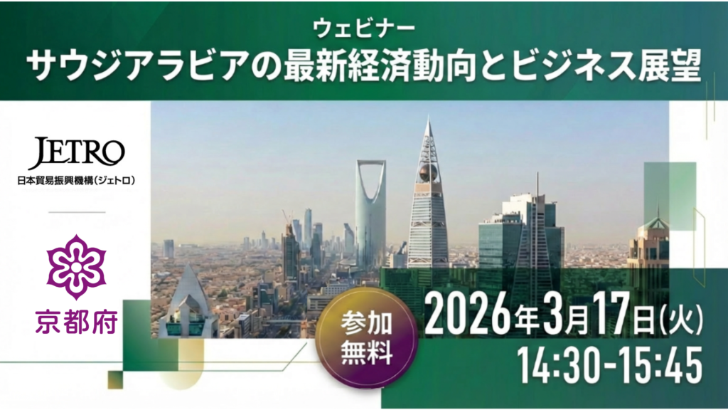 本セミナーでは、サウジアラビアの最新の経済動向を紹介するとともに、京都府産品に広がるビジネスチャンスを実際の事例を交えて解説します。中東市場への進出や輸出をご検討中の企業の皆様にとって、有益な情報を得ていただける内容です。皆様のご参加を心よりお待ちしております。